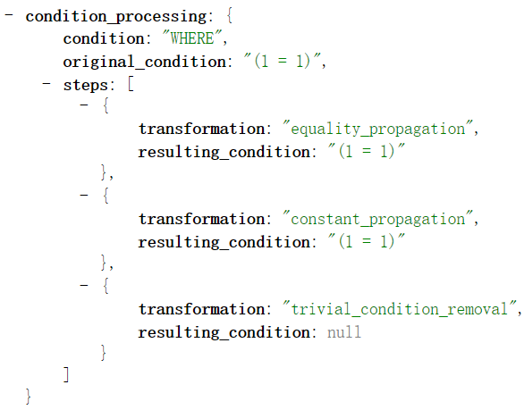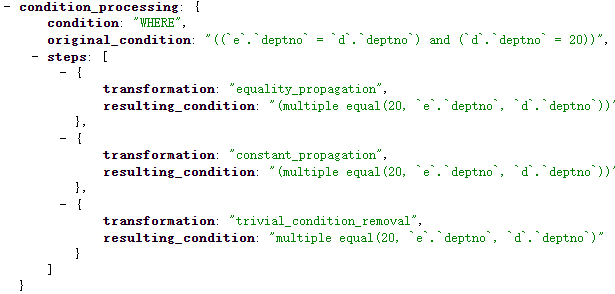 在后面是三个优化过程,每步都写明了转换类型(transformation),明确转换做的事情,以及转换之后的结果语句(resulting_condition)。这三个转换分别是: