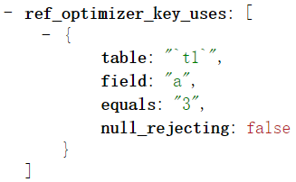 如果是使用了组合索引的多个部分,在ref_optimizer_key_uses下会列出多个结构体。单个结构体中会列出单表ref使用的索引及其对应值。如下图是示例中t1表有复合索引(a,b),执行语句为select * from t1 where a=3