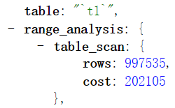 全表扫描的行数(rows)以及所需要的代价(cost)。图示可知示例中对t1表如果使用全表扫描,一共要扫描99万多行(统计信息有误差,实际是100万),其代价为202105