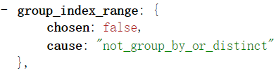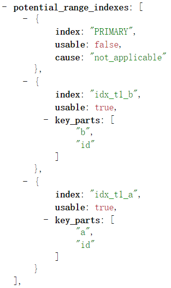 评估在使用了GROUP BY或者是DISTINCT的时候是否有适合的索引可用。当语句中没有GROUP BY或者是DISTINCT的时候,该结构体下显示chosen='false' & cause = 'not_group_by_or_distinct';如果语句中在多表关联时使用了GROUP BY或DISTINCT时,在该结构体下显示chosen='false' & cause = 'not_single_table';其他情况下会去尝试分析可用的索引(potential_group_range_indexes)并且计算对应的扫描行数及其所需代价。上面语句中没有分组或去重操作,故显示如下。