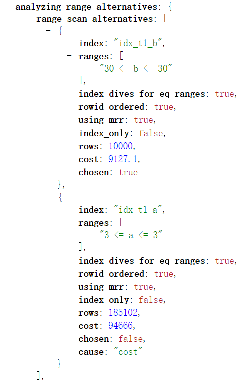 分析各索引使用成本,包括range_scan_alternatives(range扫描分析)、analyzing_roworder_intersect(index merge分析)两个阶段,分别针对不同的情况进行执行代价的分析,从中选择出更优的执行计划。如下图中对比了b、a两个字段索引的成本如何。在仅有这两个索引的情况下,显然b索引的效率更高(实际是b字段的选择率更好),因此在choose部分,b字段索引显示为true。