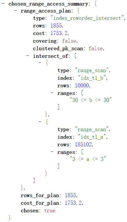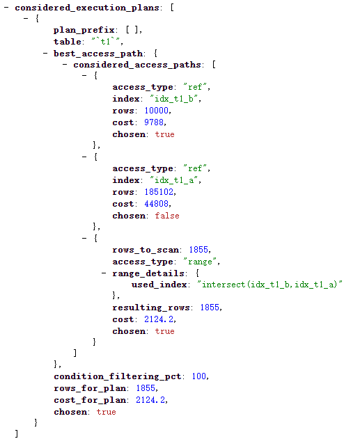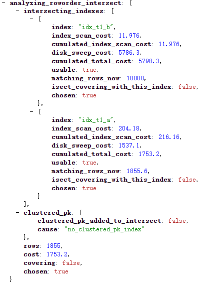 对比实际的不同路径的成本。如果是多表关联,且有存在执行顺序(如left/right join或straight_join来强制指定顺序),则在plan_prefix部分会有前置条件;否则,就按照所有可能性评估。如下图,还是选择了索引合并。