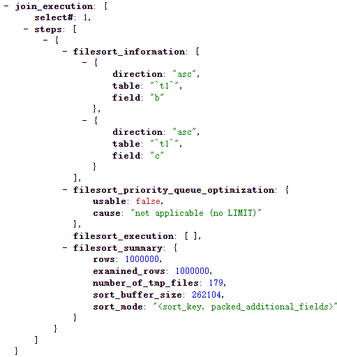在SQL在阶段,大部分都是空白的。只有当语句中包含有排序等操作时,才会在此部分显示。如下图是执行select * from t1 order by b,c的输出。这里面包括可能在排序上的一些优化及实际执行中的开销。