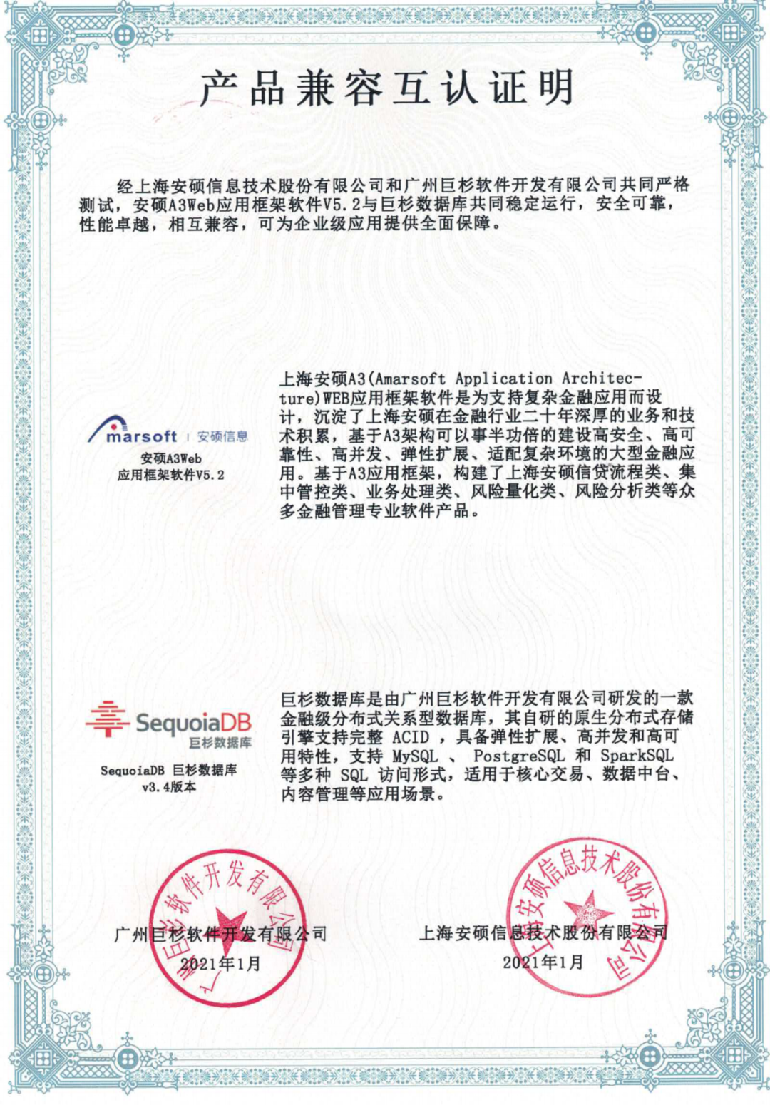 日前,广州巨杉软件开发有限公司与上海安硕信息技术股份有限公司(简称安硕信息)完成了产品认证工作,经双方共同严格测试,巨杉数据库与A3Web应用框架软件V5.2 共同稳定运行,安全可靠,性能卓越,相互兼容,可为企业级应用提供保障。