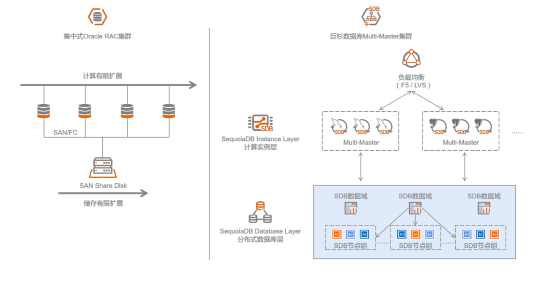 在解决OLTP数据库系统的横向扩展能力方面,Oracle提供了RAC集群,可以实现到Multi-Master的多主节点扩展,但由于各种架构的因素,通常只能扩展到十多个服务器节点。