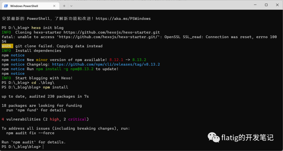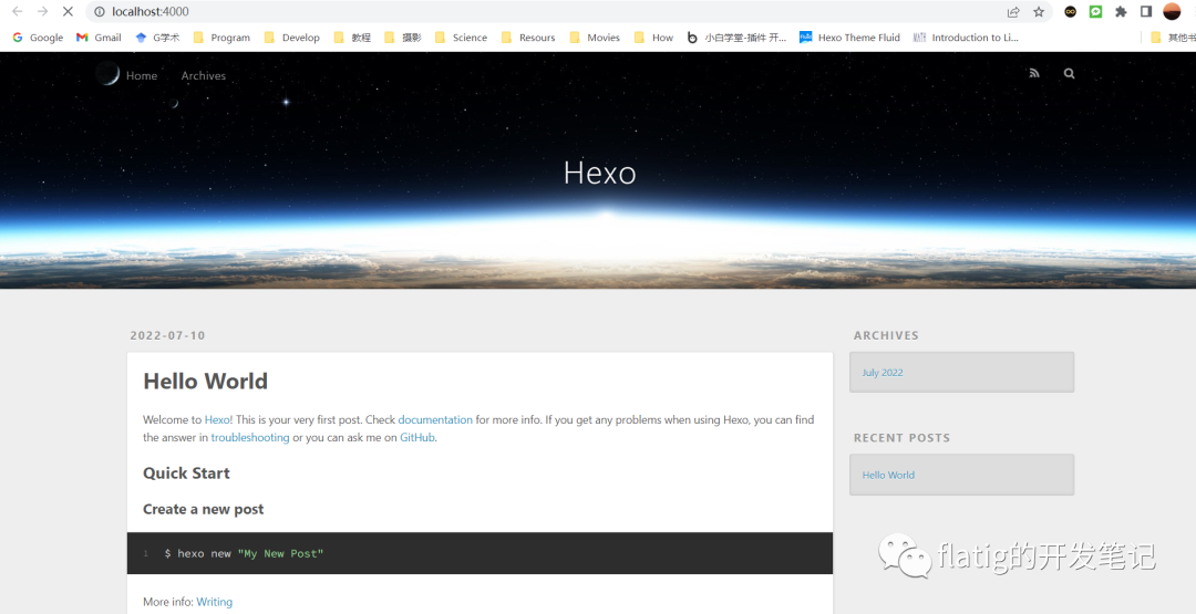 在完成上述所有操作后,在 blog 文件夹下打开终端或shell,输入如下命令: