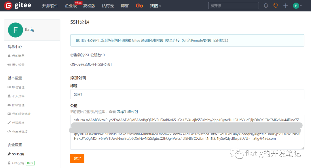 在登陆后,首先打开个人设置中的SSH公钥设置,打开我们在SSH公钥文件夹下的 id_rsa.pub 文件,将其内容全部复制,粘贴到公钥处。