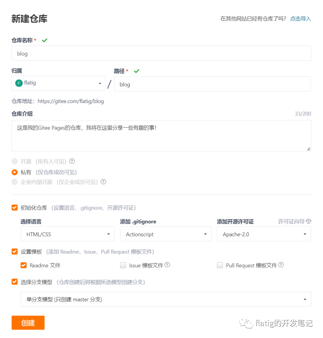 之后在Gitee中创建一个仓库,仓库名称可以随意选取,但仓库路径需要与你的用户名相同,这样才可以用于创建网站。