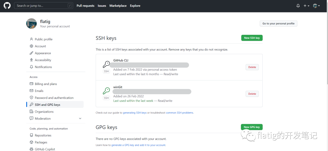 在登陆后,首先打开 Settings 中的 SSH and GPG keys,打开我们在SSH公钥文件夹下的 id_rsa.pub 文件,将其内容全部复制,粘贴到公钥处。