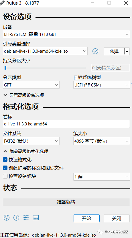 选择你的U盘和刚下载的iso文件,不需要更改其他设置,直接开始写入。若询问要以哪种方式写入(iso或dd,dd为Linux上主要用于转换和输出文件的命令),推荐选择iso模式。然后静静等待写入完成。