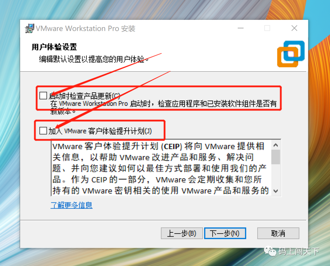 取消勾选“启动时检查产品更新(C)”和“加入 VMware客户体验提升计划(J)”,不需要这些