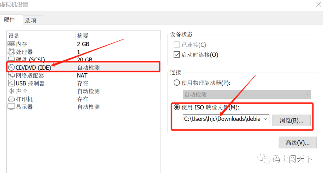 选择“CD/DVD(IDE)”后,在连接中选择“使用 ISO 映像文件(M)”,再点击“浏览(B)”选中下载的Debian ISO镜像 debian-10.9.0-amd64-netinst.iso