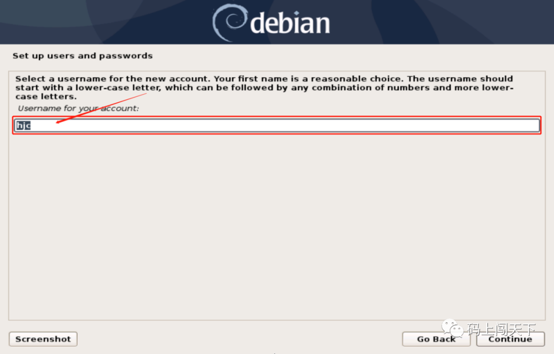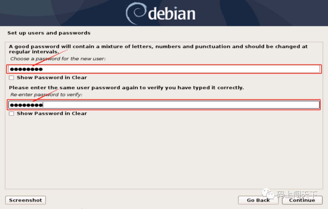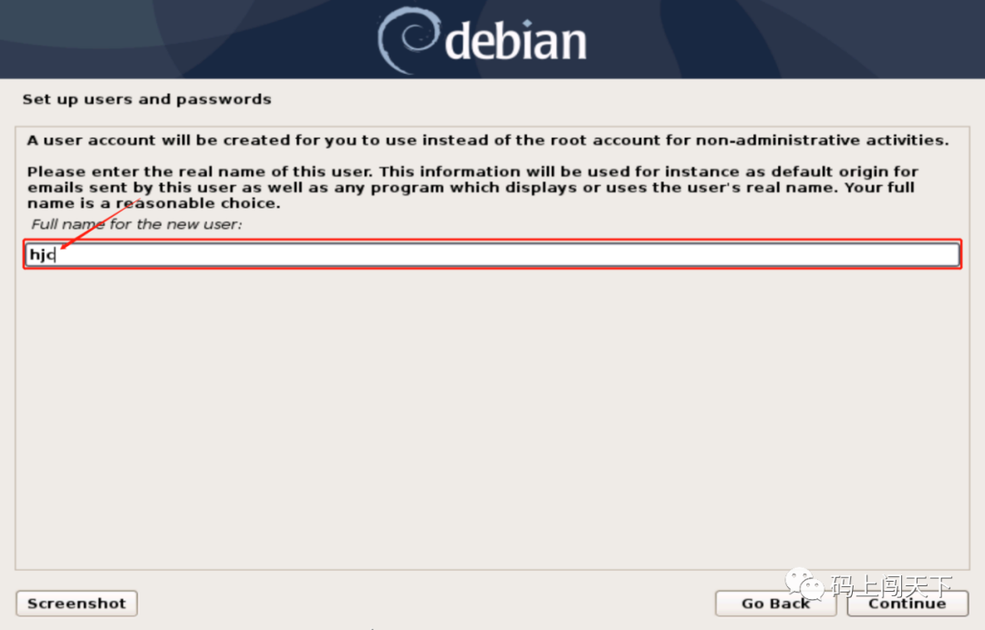 输入“Choose a password for the new user”和“Re-enter password to verify”,设置hjc用户的账号密码