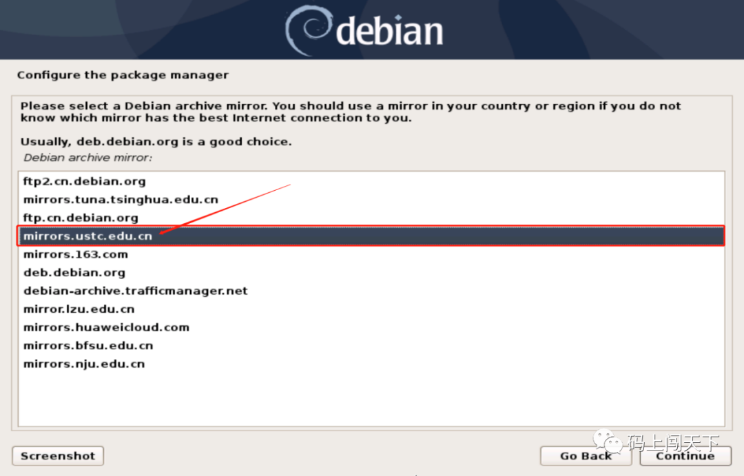 选择为国内的镜像,如中科大的“mirrors.ustc.edu.cn”