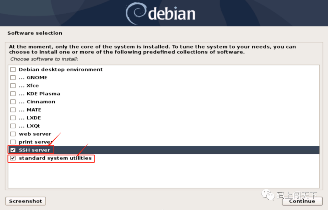 取消勾选“Debian desktop environment”(桌面环境)和"print server"(打印服务),只要确保勾选“standard system utilitie”即可,因为是作为服务器使用,此处还勾选了“SSH server”