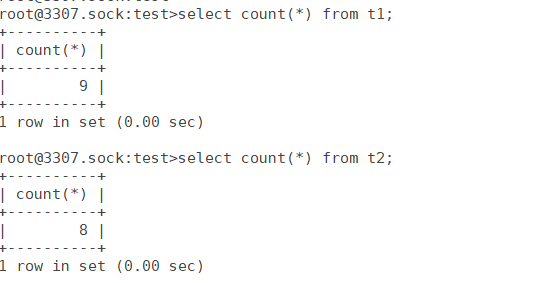 演示中数据较少使用count(*)和select* 即可进行比较,生产中数据量大,环境复杂建议使用pt-table-checksum进行一致性校验.