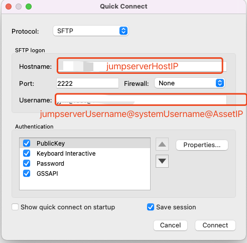 支持@格式:sftp jumpserverUsername@systemUsername@AssetIP@jumpserverHostIP -p2222
