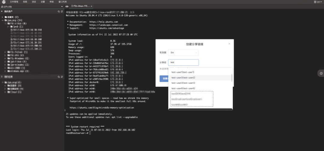系统管理员可以在“系统设置”→“安全设置”中开启会话分享,用户使用Web终端连接资产时,可分享该会话,并设置有效期和加入者。