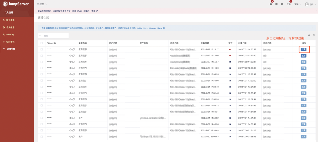 ▲ 图4 用户可查看自己连接的令牌信息,也可以手动点击“过期”按钮,使令牌立即过期