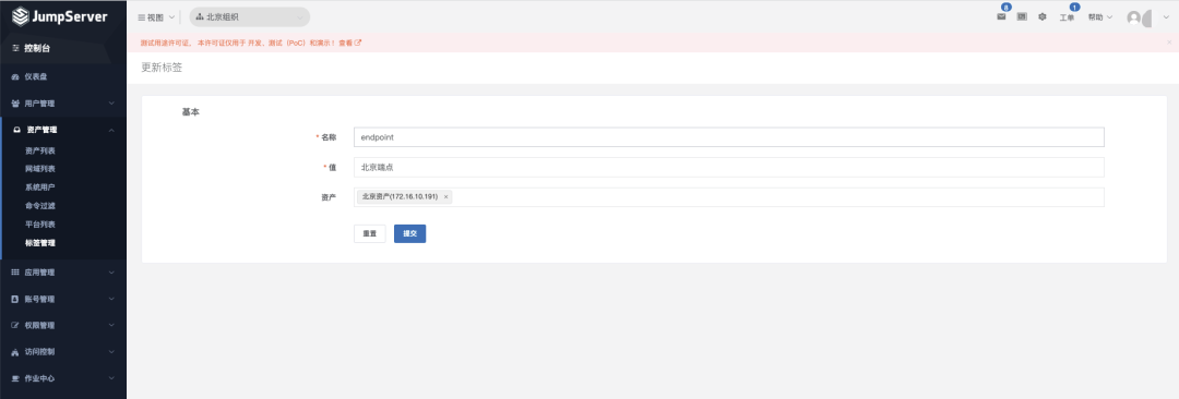 ④ 北京组织创建标签,标签名必须为endpoint,值为端点的名称,例如示例中是北京端点;