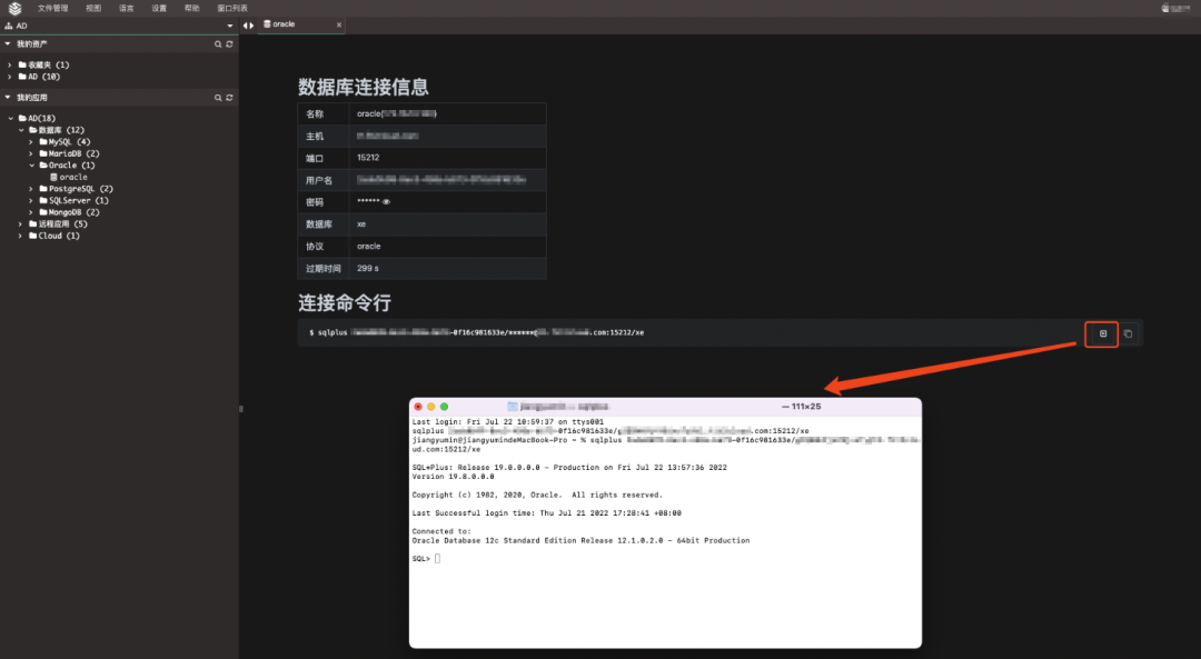 用户可以通过Web终端点击”Oracle”数据库,选择“DB Client”连接方式,获取数据库连接信息。用户可以点击“拉起客户端”按钮,直连数据库;还可以复制命令行连接信息,到Terminal执行命令去连接数据库;还可以使用数据库客户端工具(例如Navicat,暂不支持SQL Developer)连接数据库。