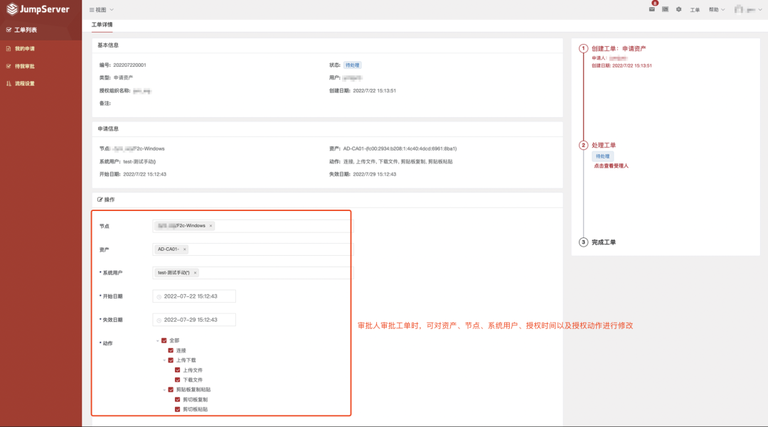 ▲ 图14 审批人审批资产工单时,可对资产、节点、系统用户、授权有效期、授权动作进行修改