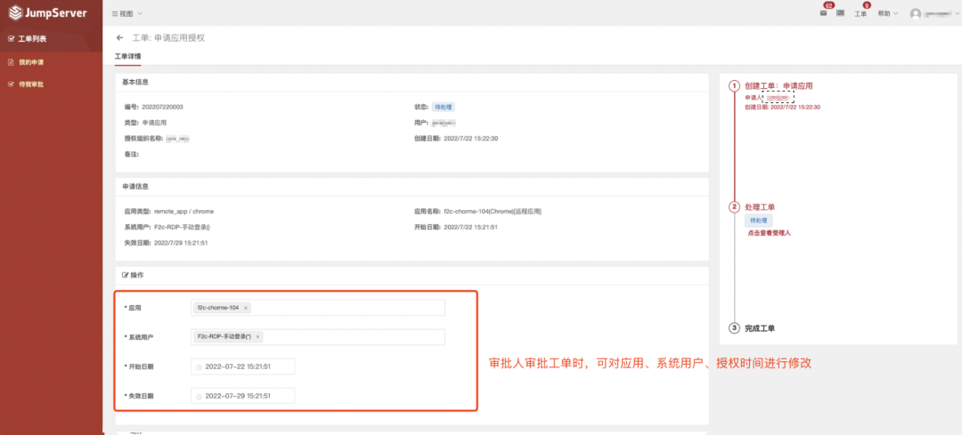 ▲ 图15 审批人审批应用工单时,可对应用、系统用户、授权有效期进行修改