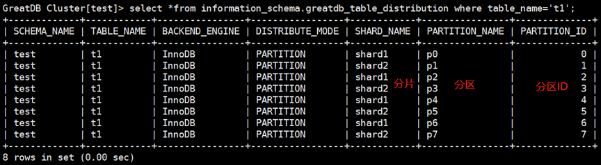 1)hash分区表:一般针对主键列或唯一性约束的数值类型的列,这样通过hash算法使数据散列程度更高,数据相对分布更均匀。GreatDB支持无主键、无唯一性索引表的创建,后端内部通过增加隐藏字段hidden_pk来保证数据的唯一和快速定位。访问后端shard分片信息如下: