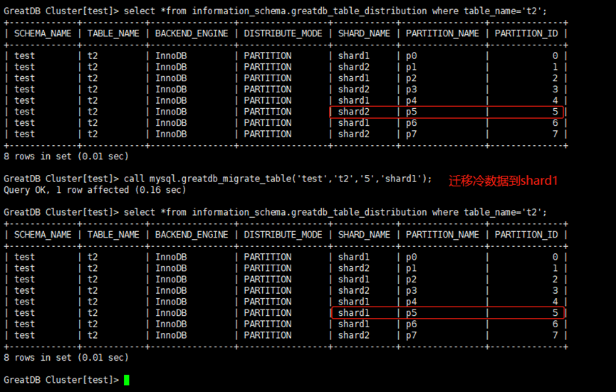 3、支持数据跨片更新及跨分片迁移:支持时间范围分区的冷热数据归类迁移。在涉及跨分片或更新分片字段时,GreatDB对前端用户透明,无需先删除再插入的处理方式,正常DML操作即可,无任何限制。且SQL语法无过多SQL前缀、后缀等晦涩难懂的语法变体,从DBA使用习惯和MySQL生态上来说更友好。