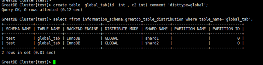 create table global_tab(id int ,c2 int)comment 'disttype=global';--关键词 "disttype=global"