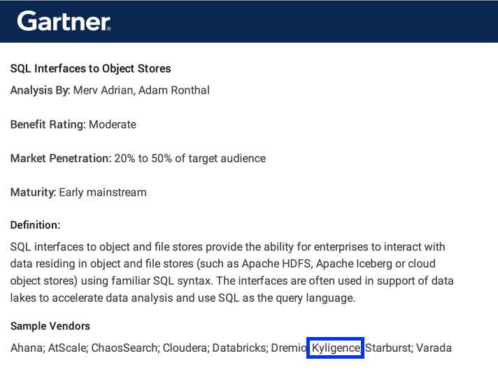 今年 6 月,全球权威的技术研究与咨询公司 Gartner 发布《2022 数据管理技术成熟度曲线报告》(Hype Cycle for Data Management, 2022)。企业级智能多维数据库服务商 Kyligence 凭借技术积累和产品优势,再次成功当选“对接对象存储的 SQL 查询接口” 代表厂商。