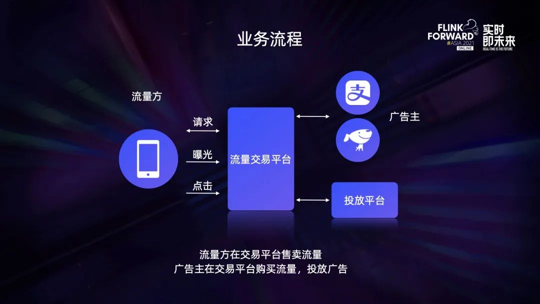 构建实时数据分析平台是为了更好的解决业务对更高数据时效性的需求,先简单介绍一下业务流程。从日常的场景说起,当我们打开手机 APP 时,常会看到广告。在这样一个场景中,涉及到了两个比较重要的角色。一是手机 APP,即流量方;另一个是投广告的广告主,如支付宝、京东会投放电商广告。广告主购买流量方的流量投广告就产生了交易。讯飞构建了一个流量交易平台,流量交易平台主要的职能是聚合下游流量,上游再对接广告主,从而帮助广告主和流量方在平台上进行交易。讯飞还构建了投放平台,这个平台更侧重于服务广告主,帮助广告主投放广告,优化广告效果。在上述的业务流程图中,APP 与平台交互时会向平台发起请求,然后平台会下发广告,用户随后才能看到广告。用户看到广告的这个动作称之为一次曝光,APP 会把这次曝光行为上报给平台。如果用户点击了广告,那么 APP 也会上报点击行为。广告在产生之后发生了很多行为,可以将广告的整个过程称为广告的一次生命周期,不仅限于图中的请求、曝光、点击这三次行为,后面可能还有下单、购买等。