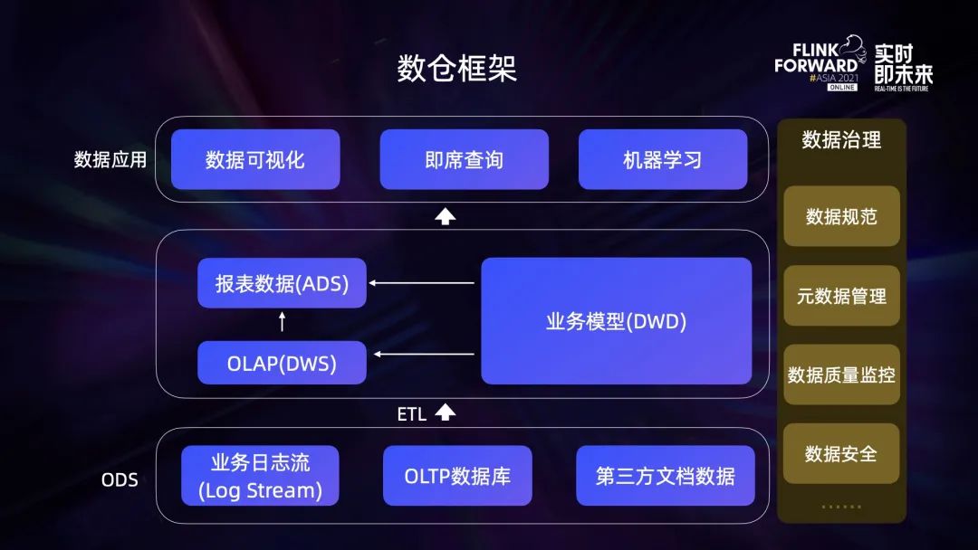 上图是一个典型的数仓分层框架,最底层是 ODS 数据,包括业务日志流、OLTP 数据库、第三方文档数据。经过 ETL 将 ODS 层的数据清洗成业务模型,也就是 DWD 层。