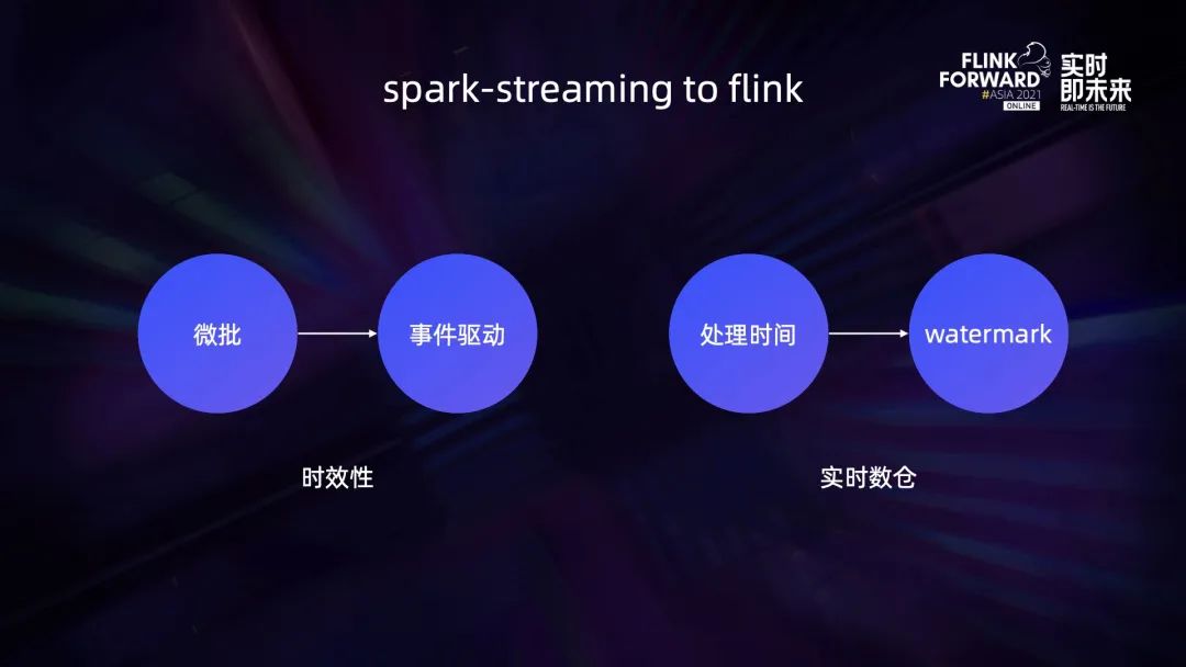 随后逐渐将 spark-streaming 迁移到了 Flink 上,主要是因为 Flink 更高的时效性和对事件时间的支持。当初 spark-streaming 的实践是微批的,一般设置 10 秒或是 30 秒一批,数据的时效性顶多是秒级的。而 Flink 可以支持事件驱动的开发模式,理论上时效性可以达到毫秒级。当初基于 spark-streaming 的实时数据流逻辑较为简陋,没有形成一个数仓分层的结构。而 Flink 可以基于 watermark 支持事件时间,并且支持对延迟数据的处理,对于构建一个业务逻辑完备的数仓有很大的帮助。