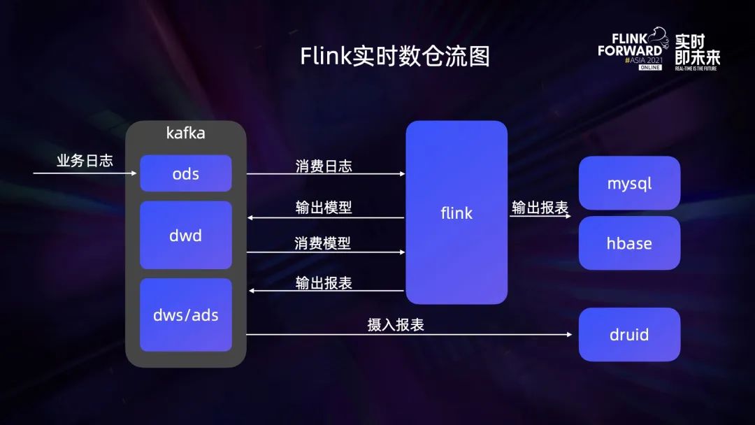 如上图所示是 Lambda 大数据框架,流式计算部分是 Kafka+Flink,批处理则是 HDFS+Spark。