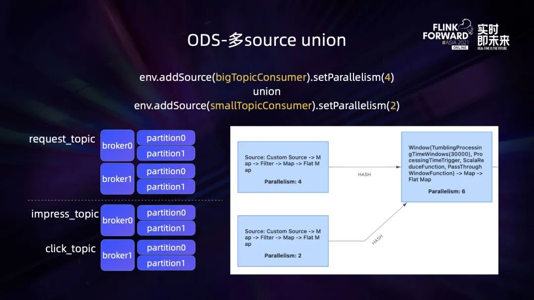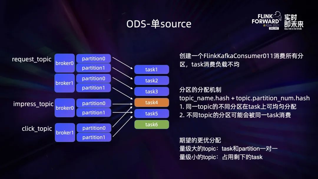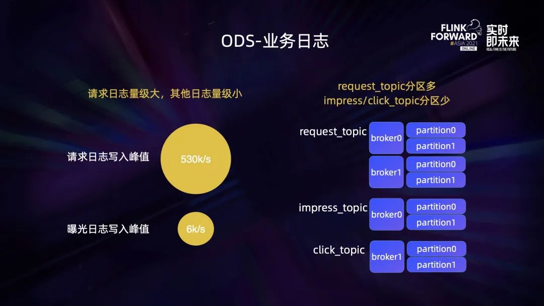 ODS 业务中,请求日志量级大,其他日志量级小。这样请求日志(request_topic)在 Kafka 上分区多,曝光和点击日志(impress/click_topic)分区少。