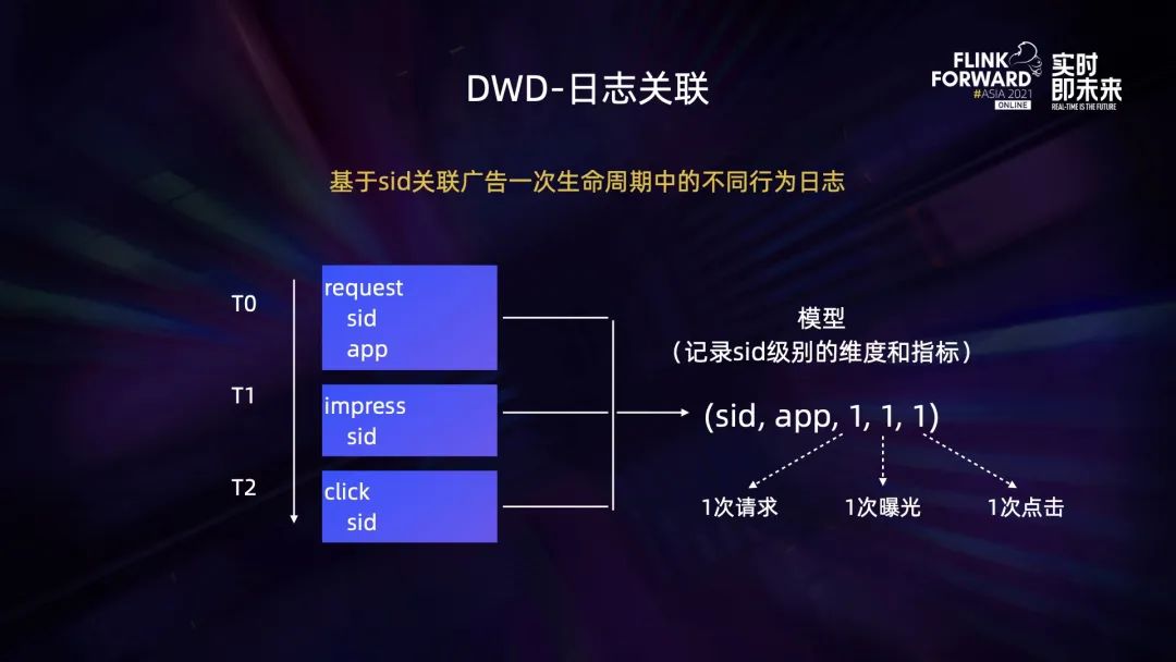 DWD 是业务模型层,需要实现的一个关键逻辑是日志关联。基于 sid 关联广告一次生命周期中的不同行为日志。业务模型记录了 sid 级别的维度和指标。