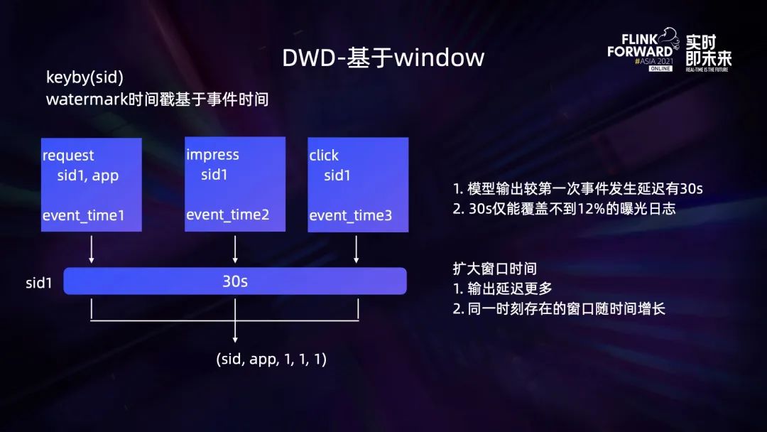 最初是基于 30s 的 window 来做关联,但这种方式会导致模型输出较第一次事件发生延迟有 30s,并且 30s 仅能覆盖不到 12% 的曝光日志。如果扩大窗口时间则会导致输出延迟更多,并且同一时刻存在的窗口随时间增长,资源消耗也比较大。