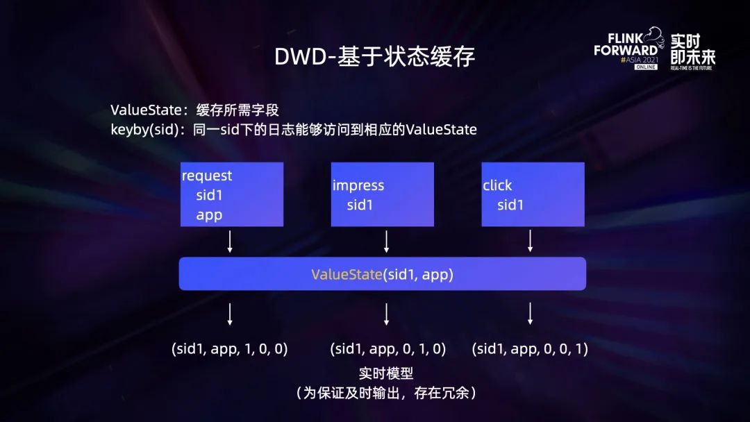 后续改成了基于状态缓存的方式来实现日志关联,即 ValueState。同一 sid 下的日志能够访问到相应的 ValueState。不过为保证及时输出,将请求、曝光、点击等不同指标,拆分到了多条数据中,输出的数据存在冗余。