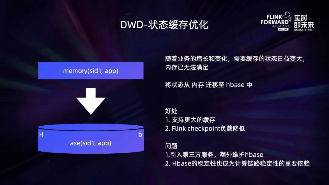 随着业务的增长和变化,需要缓存的状态日益变大,内存已无法满足。于是我们将状态从内存迁移至 HBase 中,这样做的好处是支持了更大的缓存,并且 Flink checkpoint 负载降低。但同时也带来了两个问题:引入第三方服务,需要额外维护 HBase;HBase 的稳定性也成为计算链路稳定性的重要依赖。