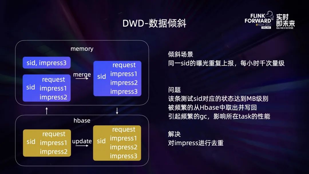 在 HBase 状态缓存中,遇到一个数据倾斜的问题,某条测试 sid 的曝光重复上报,每小时千次量级。如上图,该条 sid 对应的状态达到 MB 级别,被频繁的从 HBase 中取出并写回,引起频繁的 gc,影响所在 task 的性能。解决办法是根据业务逻辑对 impress 进行去重。3.3 DWS - 实时 OLAP