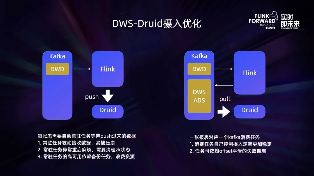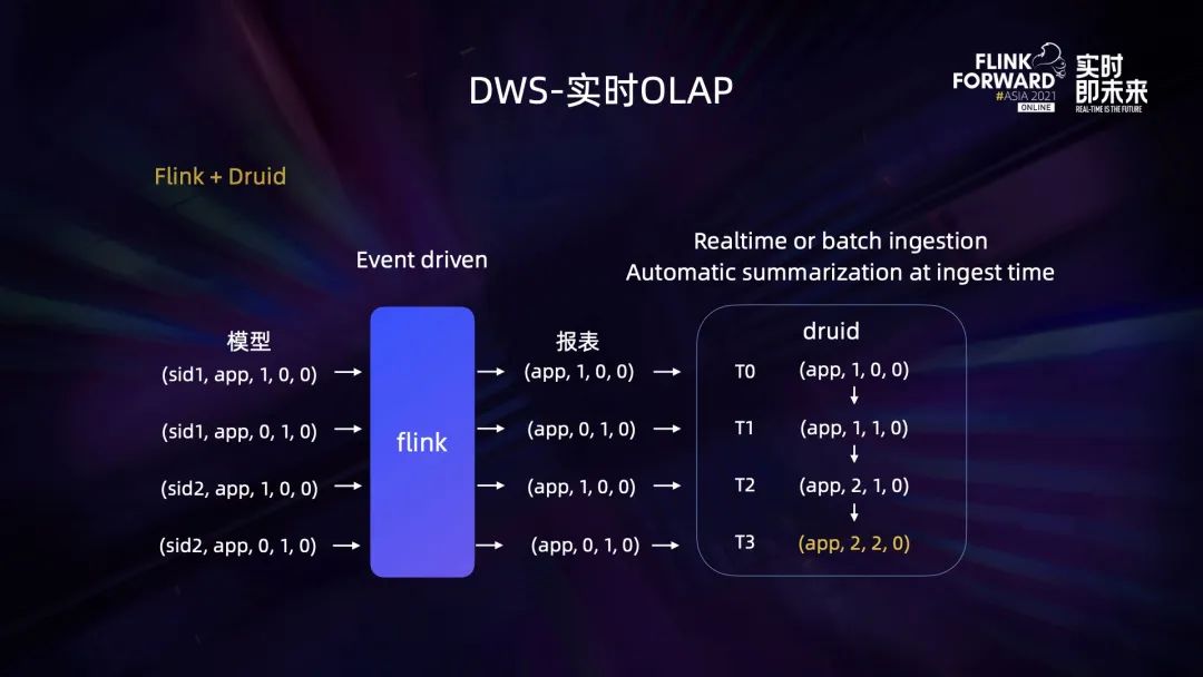 在 DWD 层基于 Flink 的事件驱动已经实现了实时模型,再由 Flink 来消费处理实时模型,从中提取出维度和指标,然后逐条的向后输出。在这个过程中已是能输出一个实时 OLAP 的结果了,但也需要有个后端的存储来承接,我们因此引入了 Druid。Druid 可以支持数据的实时摄入,并且摄入的结果实时可查,也可以在摄入的同时做自动的聚合。