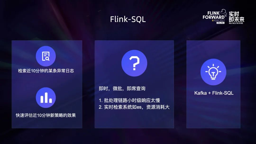 最后聊一下对 Flink-SQL 的想法:检索近 10 分钟的某条异常日志、快速评估近 10 分钟新策略的效果都属于即时、微批、即席查询。批处理链路小时级响应太慢;实时检索系统如 ES,资源消耗大。可以利用 Kafka + Flink-SQL 解决上述问题,Kafka + Flink-SQL 也是今后计划尝试的方向。▼ 关注「Apache Flink」,获取更多技术干货 ▼更多 Flink 相关技术问题,可扫码加入社区钉钉交流群~