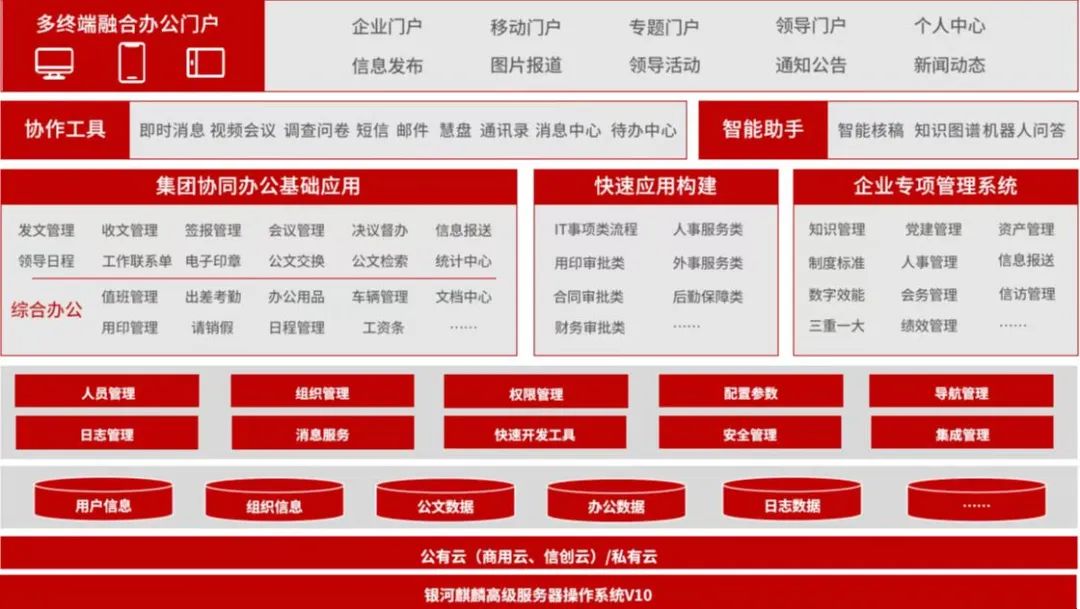 方案基于银河麒麟高级服务器操作系统V10,搭载慧点科技WE.Office协同办公平台,该平台是慧点科技按照国家标准规范打造的一体化办公平台,以“办文、办会、办事”业务为主线,遵循“基础平台+应用”的设计理念,整合众多办公管理类应用功能,通过技术融合、业务融合、数据融合,实现跨层级、跨地域、跨部门、跨业务的协同办公管理和服务。方案适用于政府、企业、金融等行业,助力提升协作效率、保障数据安全、降低运营成本,是大型组织数字化转型加速器。