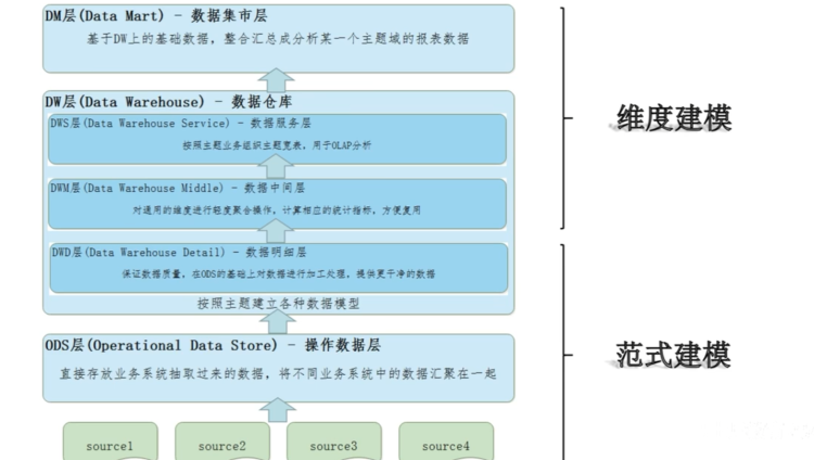在我学习的课程中我见过两种数据仓库的建模方式,第一种就是图中所示那样,在数据仓库除了数据明细层以外,还有数据中间层和数据服务层。