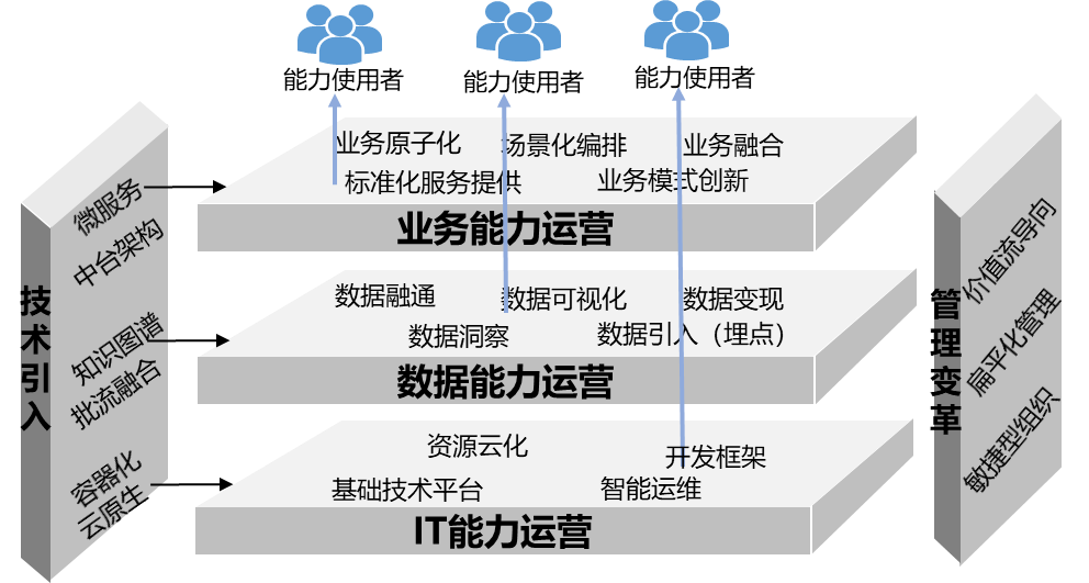 IT不再是单纯的需求支撑,而是全域、全流程、全业务的体系化能力运营,向上聚合生态、向下融合资源,充分发挥技术红利,全面赋能数字化商业形态,助力数字化转型战略达成。 IT部门的思维方式也需要改变,从成本中心思维转向利润中心思维,通过管理模式的转变和新技术的引入为企业提供新动能。那么能力运营该如何实现呢?笔者认为目前能力运营主要包括三部分:业务能力运营、数据能力运营、IT能力运营。