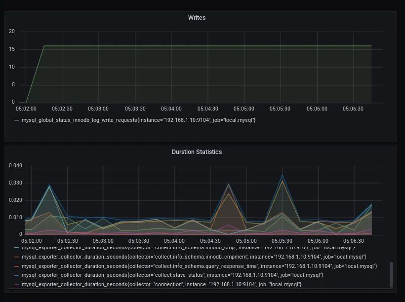 ## Prometheus.yml# my global configglobal: scrape_interval: 5s # Set the scrape interval to every 15 seconds. Default is every 1 minute. evaluation_interval: 5s # Evaluate rules every 15 seconds. The default is every 1 minute. # scrape_timeout is set to the global default (10s).# Alertmanager configurationalerting: alertmanagers: - static_configs: - targets: # - alertmanager:9093# Load rules once and periodically evaluate them according to the global 'evaluation_interval'.rule_files: # - "first_rules.yml" # - "second_rules.yml"# A scrape configuration containing exactly one endpoint to scrape:# Here it's Prometheus itself.scrape_configs: # The job name is added as a label `job=<job_name>` to any timeseries scraped from this config. - job_name: 'prometheus' # metrics_path defaults to '/metrics' # scheme defaults to 'http'. static_configs: - targets: ['localhost:9090'] - job_name: 'local.mysql' static_configs: - targets: ['192.168.1.10:9104']