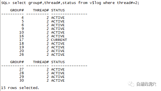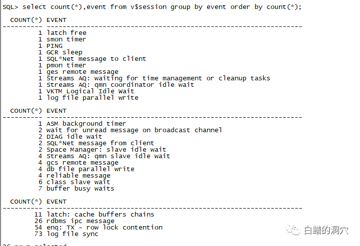从上面的图可以看出,在这个正在做压测的实例上,除了当前的之外,几乎所有的REDO LOG组都是ACTIVE的。如果我们使用的是十多年前的硬件,出现这种情况意味着数据库性能已经出现了问题。因此如果看到这种情况,我们就必须加大REDO LOG文件的大小或者增加日志组的数量了。而实际上的情况更为复杂,如果你的硬件足够好,IO足够强,那么这种情况并不一定有太大的危害。如果你不经常看到大量会话等待Log file switch complete等待事件的时候,这种状态的风险并不大。比如下面: