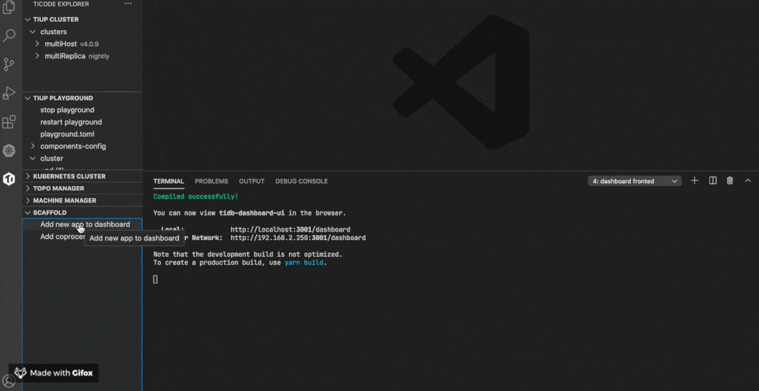 项目开发之初完全是原生态开发模式,大家一边实现自己擅长和最想做的部分,一边把想法记录下来列为 TODO。初步分工为宝灵哥负责实现脚手架及集群管理功能;阿磊负责调试功能的实现;小龙担任队长,负责产品及 K8S 部分功能的实现,同时他还是团队的灵感担当,不仅输出项目灵感,还根据三个人的 GitHub 首字母将团队取名为 B.A.D,很霸气的名字,全员好评。经过几天紧张且充实的发开,TiDE 终于初见雏形,它主要实现了以下几个重要功能:一键为 TiDB 生态中某个或某几个组件添加一项新功能,目前已经拥有一键为 TiDB Dashboard 添加一个 APP 的能力,添加之后用户只需要修改默认实现就能快速将自己想要的功能添加到 TiDB 生态当中。