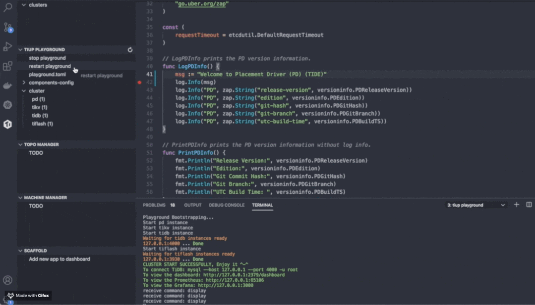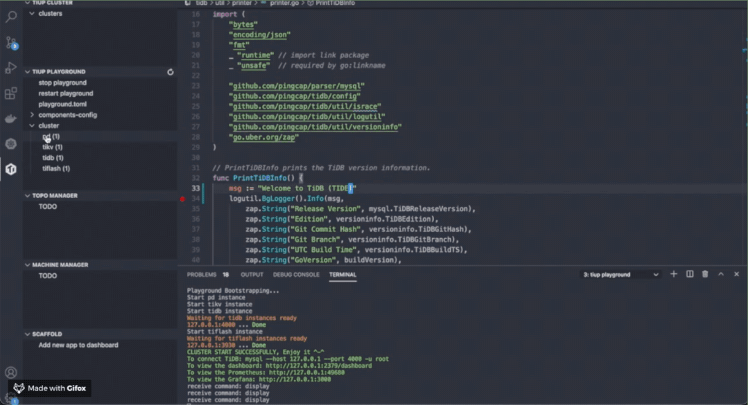 大赛前一周,我司 CTO 黄东旭突然在群里说他有一个特厉害的 idea,这个想法起源于几周前,东旭本来想给 TiDB 加点功能,但是 TiDB 的代码太复杂,折腾了三天才把环境搭好,最后也没把代码写成。所以他想做个 VSCode 插件,有点类似脚手架,当开发者想加一个功能时,可以一键帮他把模板代码在 TiDB/TiKV/PD 组件中都直接生成出来,只需要自己往里面填充逻辑代码就行了。团队成员李逸龙从这个 idea 受到了启发,他发现 TiDB/TiKV/PD 的研发同学在日常开发时,需要自己手动替换服务器上的二进制和修改组件配置,重启后再手动去捞日志看结果,过程非常繁琐,同时在本地对各大组件同时进行 debug 单步调试也很复杂。他就想到能不能用 VSCode 插件把这些工作都自动化处理呢?类似 K8S 的 VSCode 插件,通过这个插件不用敲一行代码就可以管理 K8S 集群。于是研发工程师李逸龙、前端工程师黄宝灵和 K8S 专家吴叶磊三个人一拍即合,都觉得这个 idea 太好了,直击痛点!通过讨论,三个人大致确定了项目方向,开发一个为 TiDB 开发者打造的一站式 IDE,提升效率的神器!项目设计: